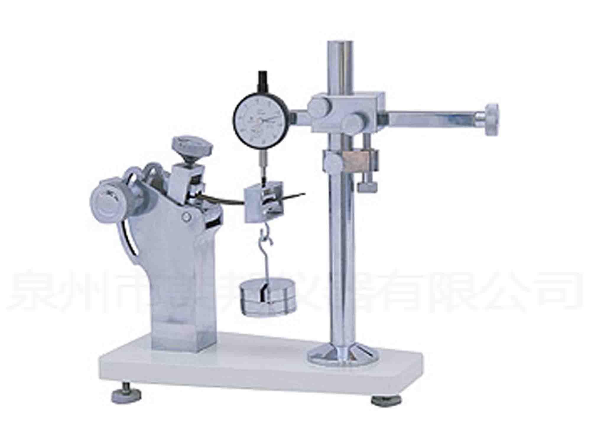 本機系用來測試皮鞋勾心的縱向抗彎強度。測試時,將鞋后幫端固定,前端掛上砝碼便試件變形,量取勾心的彎曲撓度,作為計算抗彎強度的依據(jù)。