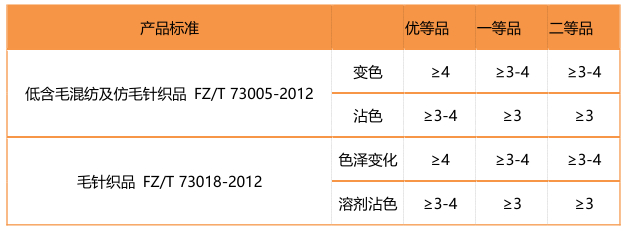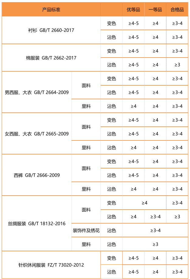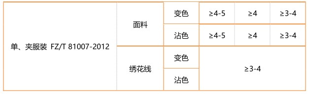 不同的產(chǎn)品對(duì)于耐干洗色牢度的要求也有所不同。小編為大家列舉了一些常用的服裝對(duì)耐干洗色牢度的考核等級(jí)。